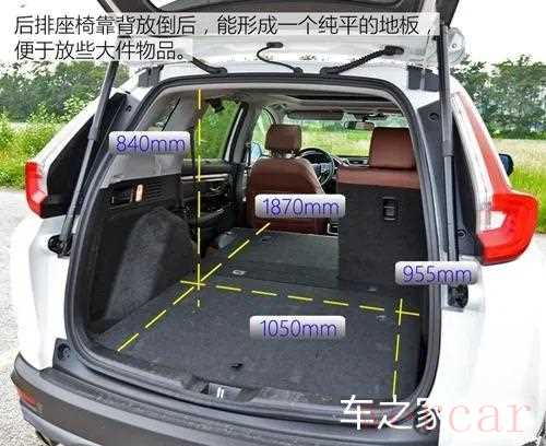 本田素有“空间魔术师”著称,而本田CR-V就是一个例子,一台紧凑型SUV,空间丝毫不逊色一些中型SUV的空间。在平时使用过程中上下车很方便,前排座椅和后排座椅都提供宽敞的空间,像中央控制台一样,存储空间众多且经过精心布局设计。至于后备箱,尺寸达到955mm*1050mm*840mm,具体如下图所示。