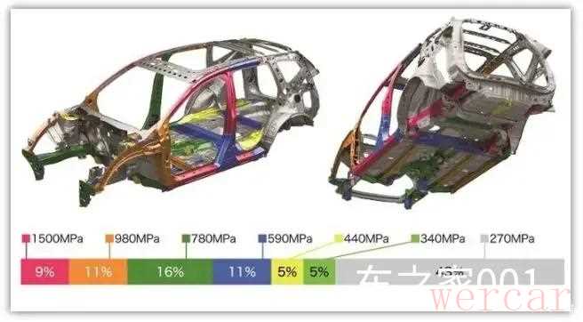 本田CRV全车涵盖高强度钢材的占比仅为35%,这是非常非常一般的水平。且车身结构中的超高强度钢占也仅仅为9%;位置包括主驾驶门一侧的A柱和B柱的上半部分,以及门槛位置采用了辊压结构进行了加强,钢材的屈服强度为1500Mpa。副驾驶一侧的A柱为普通高强度(980Mpa)的钢材,B柱低至780Mpa,由于副驾驶侧不会进行偏置碰撞测试,所以这台车的副驾位安全等级很低。