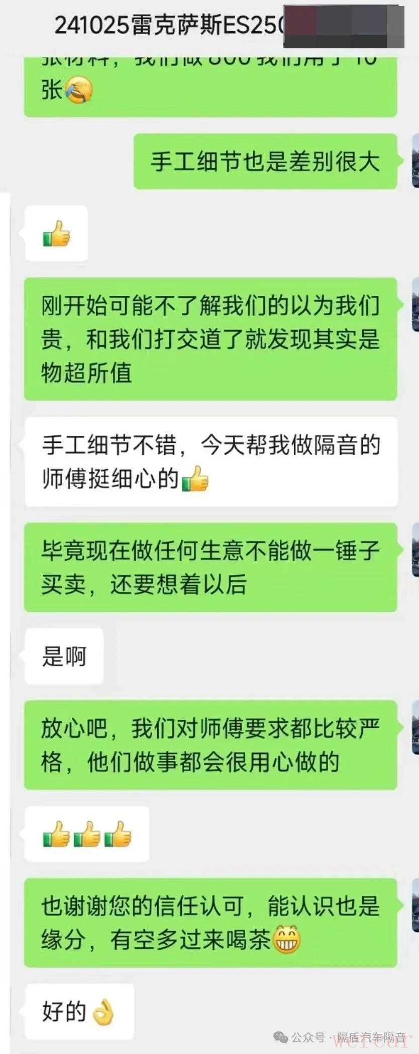 隔盾隔音的施工团队有着严格的要求,力求每一个细节都经得起推敲。毕竟,隔音不是“一锤子买卖”,而是需要长期体验的服务。唯有用心施工,才能赢得车主长久的信任,降噪效果才看得见、听得见。客户的效果好评反馈就是实力的印证
