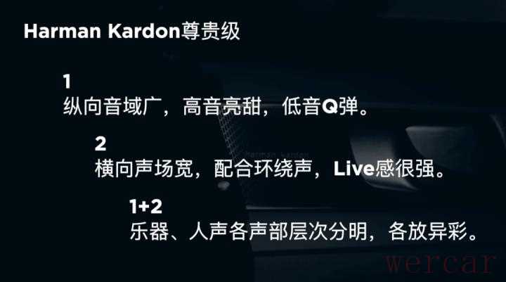 Harman Kardon这套尊贵级音响系统。第一、纵向上音域广,上天入地拉的够开。高音亮,甜。低音也下潜的够深,很有弹性。第二、横向的声场也拉的也很开。所以结合第一条,各个乐器人声就能分的很清楚。在环绕算法的帮助下,就有了悠扬的感觉。