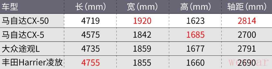 从定位上来看,CX-50比目前国内销售的CX-5定位更高,车长达到了4719mm,宽度更是达到了惊人的1920mm,同时2814mm的轴距以及仅仅1623mm的高度,也体现出了它修长、低矮的风格。