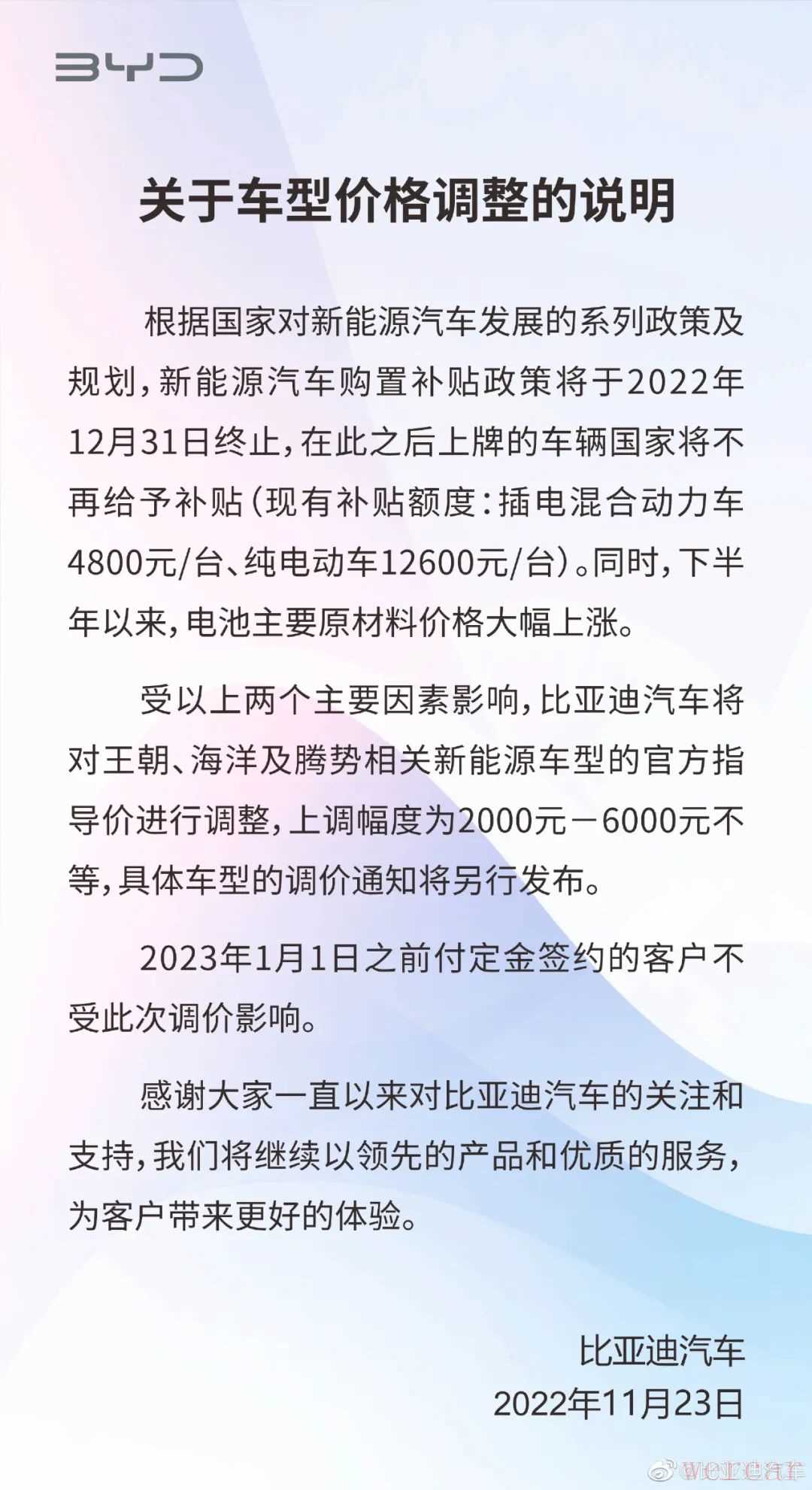 11月23日,比亚迪正式对外宣布,由于国家新能源车补贴将于2022年12月31日终止,外加电池原材料大幅上涨,比亚迪旗下的王朝、海洋、腾势系列新能源车型将会上调价格2000-6000元不等,在2023年1月1日签约定金之前的用户不受涨价影响。