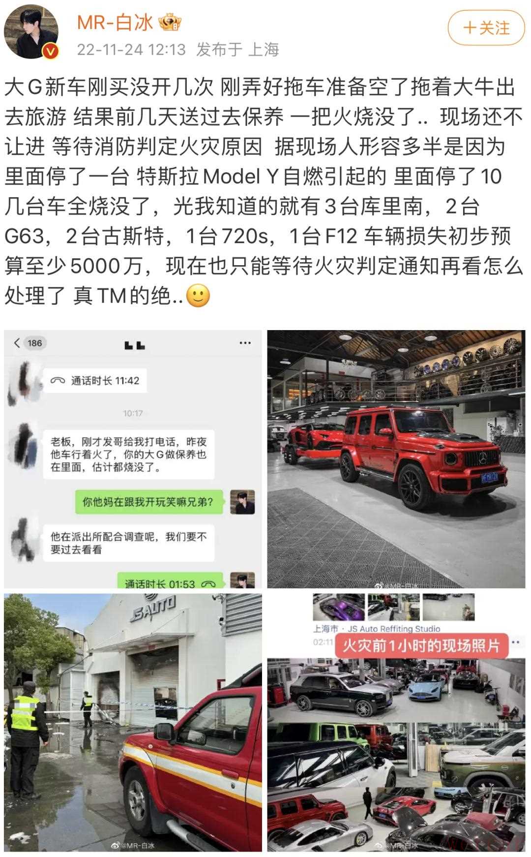 11月24日,一位名为“MR-白冰”的博主发微博表示,他新买的奔驰大G送去上海嘉定区一汽车装潢店保养时,因为店内停放的特斯拉Model Y自燃,将车行内的十几台豪车全部烧毁,初步估计损失超过5000万元。