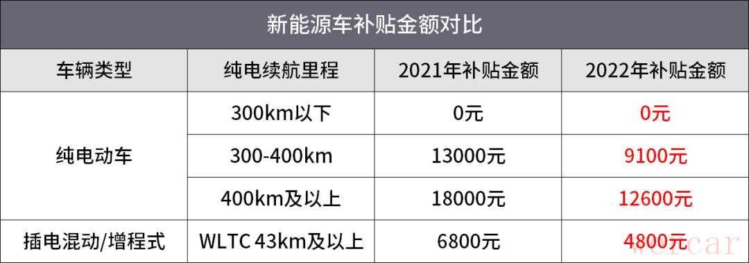 早在今年1月份的时候,工信部等四大部门就已经联合宣布,2022年新能源车补贴退坡30%,2023年新能源车不再享受补贴。目前,针对续航300-400km的电动车,国家有9100元的补贴,续航400km及以上的车型则有12600元的补贴。而对于插电混动/增程式车型,则有4800元的补贴。