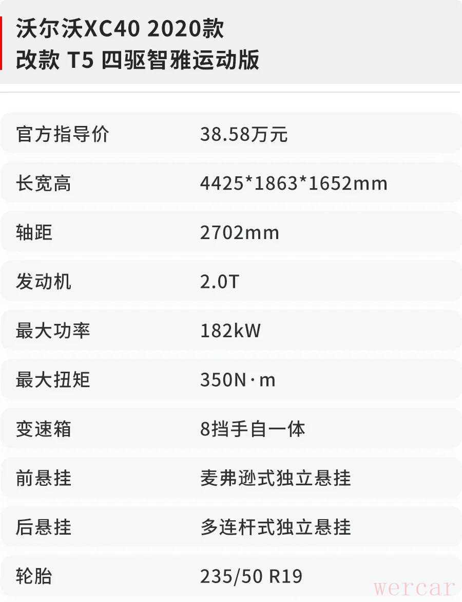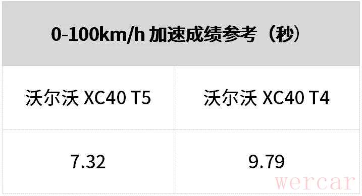 比沃尔沃XC40 T4快了2.4s沃尔沃XC40 T5 搭载了一台高功率2.0L涡轮增压发动机,匹配爱信8AT变速箱,最大功率182kW,最大扭矩350N·m。之前我们测试的T4版本车型动力系统为2.0L低功率涡轮增压发动机,匹配爱信8AT变速箱,最大功率140Kw,最大扭矩300N·m。