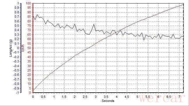 伴随着发动机转速的不断升高,XC40 T5的加速度逐渐下降,在加速中后段加速度稳定在0.4g。最终,XC40 T5的0-100km/h的加速成绩为7.32秒,属于同级别车型前10的水平。