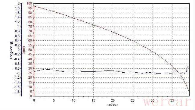 在车速达到105km/h左右时全力制动,制动初段,XC40 T5的加速度就可以突破-1g,制动力度比较迅猛。最终,XC40 T5的100km/h-0的制动距离为41.83米,制动表现不太理想。