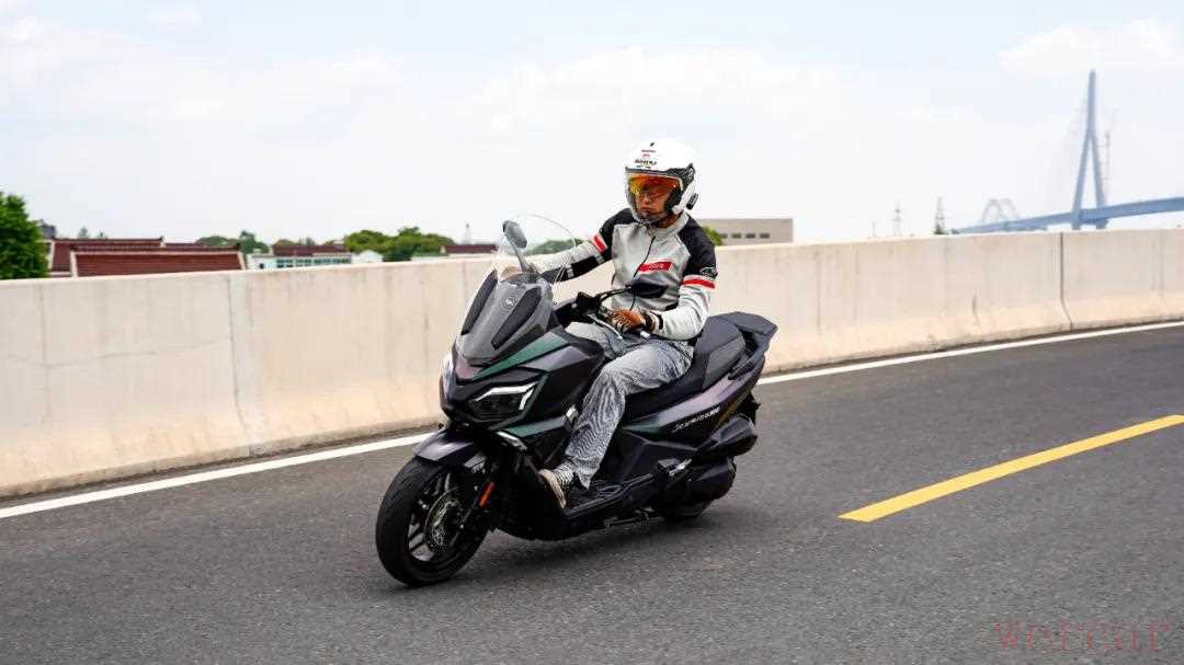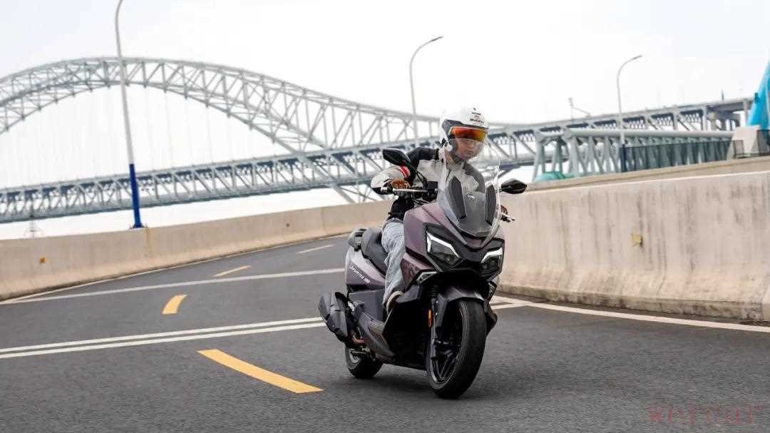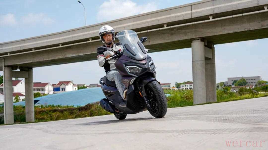 结合实测感受分析,应该是ABS的调校,ABS介入的瞬间把大部分制动压力卸掉了的感觉,让高配置的卡钳未能充分发挥效能,当然如果只是重刹但不捏到底,是不会出现这个感觉的。本次测评的是发布会的试驾车,属于首批试装车,量产车型已经有所改进。弯道体验得益于整车1490mm的短轴距设定,在封闭弯道中行者300在时速50左右,依然可以非常轻松的完成左右连续变线,车辆呈现出一定规律的摆动感,车辆尾部跟随及时,没有响应迟钝的感觉,完全没有传统平踏的尾部累赘感或外抛感,直到以时速70左右桥上高速过弯时,倒是感受到了一点外抛感,感觉大概比龙骨式运动大踏板仅逊色两三分,这对一辆平踏来说,已经是很难得了,加之减震的支撑性与回弹完全足够,令人很难相信这是一台大平踏的表现。