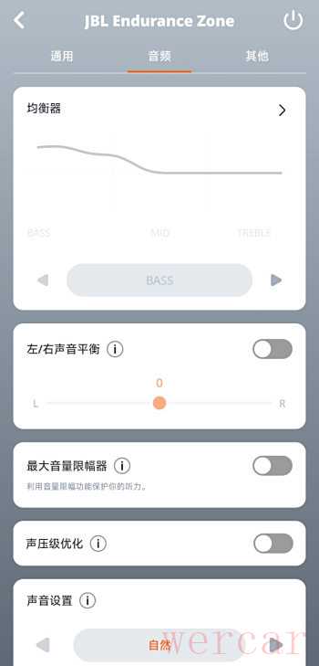 音频设置页面当然少不了EQ曲线的调节功能,用户可以使用其中的“低音”、“重低音”、“摇滚”、“放克”、“人声”、“爵士”等预设模式,当然也可以自己手动调节EQ曲线,并保存为新的预设。此外,JBL悦动圈开放式运动耳机支持左右声道音频的音量平衡调节,帮助用户适应不同场景聆听需要。下方还有可将音量限制在85dB以下的限幅器开关,以及针对通话场景的声压级优化,调整通话双向语调的设置。