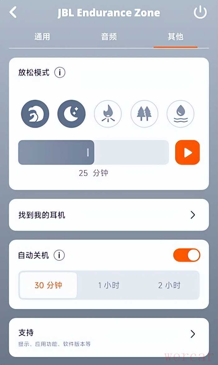 其他功能方面,JBL悦动圈开放式运动耳机同样支持白噪声播放的放松模式功能,有海浪、蝉鸣、篝火、森林、流水五种类型供用户调用与叠加混音,可支持连续播放60分钟。用户还可使用APP寻找耳机、设定自动关机时间、进行耳机与充电盒的固件升级等。