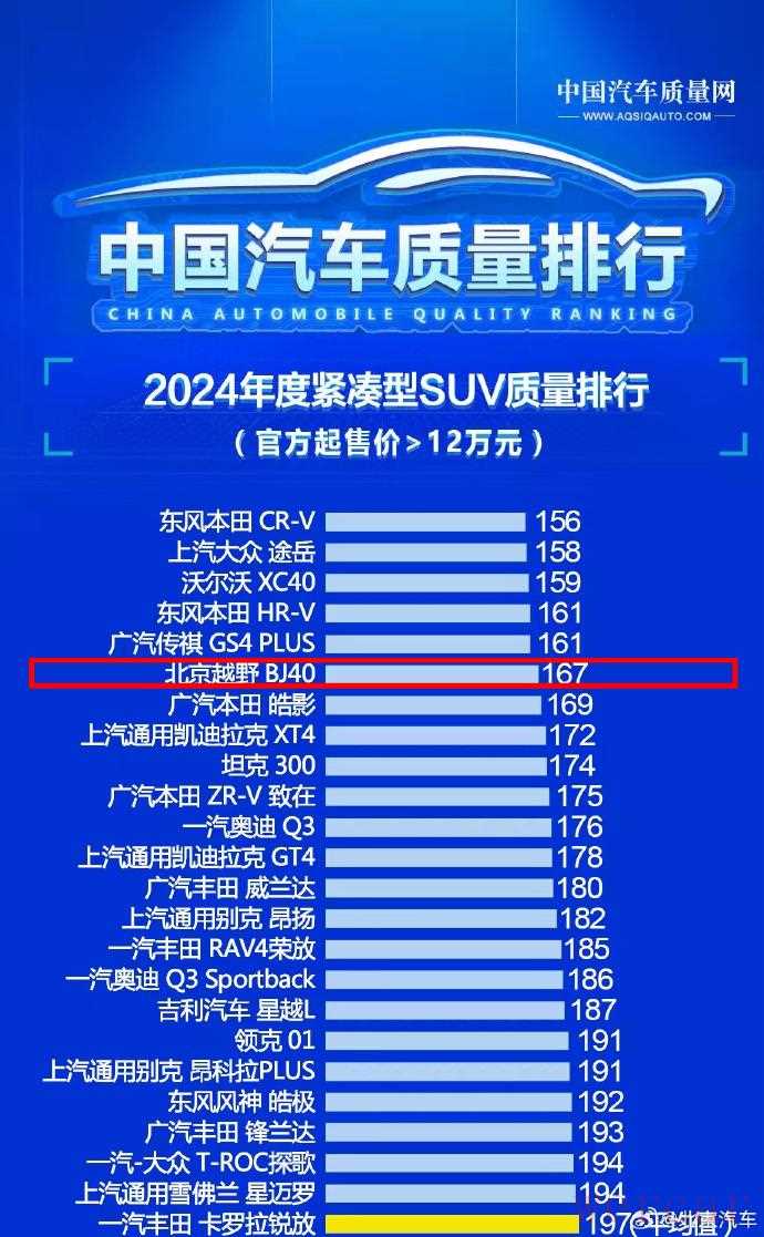 在紧凑型SUV质量榜中,北京越野BJ40位列第六