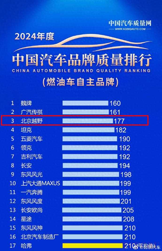 在燃油车自主品牌质量榜中,北京越野跻身前三