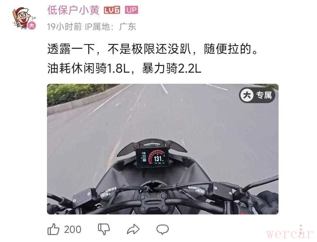 此外这位博主还在评论区放出来一张表现极速131km/h的照片,并且表示“不是极限还没趴”,在如此出色的动力表现下正常骑行百公里油耗可以达到1.8升,就算暴力驾驶百公里油耗也可以在2.2升左右。如果这数据绝对真实那么依旧和升仕150X 108公斤的整备质量以及DOHC引擎有直接关系。