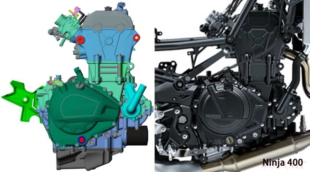 放上川崎Ninja400发动机对比一看,除了边盖造型不同之外,简直是一模一样,包括发动机固定点位、边盖螺丝、水箱管路等,完全一致。