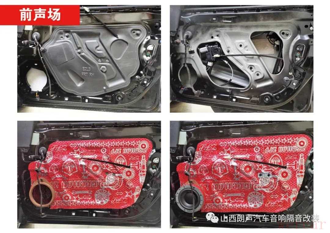 原车门板无隔音措施,为前声场做双层隔音,可以减少门板共振,为喇叭创造密闭的发音空间。喇叭安装丹拿272喇叭,使用专车专用的喇叭垫,无损安装。