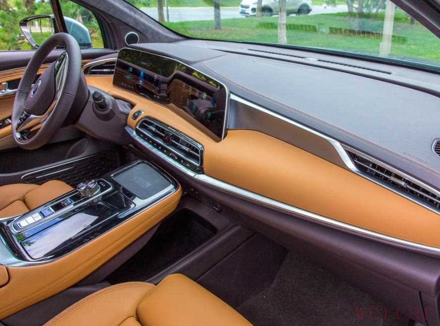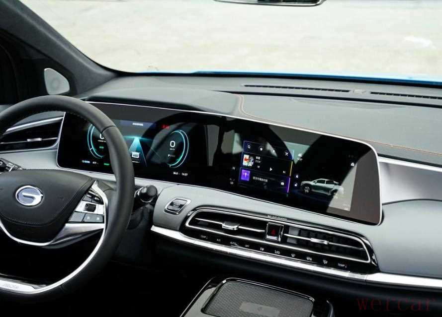 整车科技感十足的Aion LX,打开车门就令人惊艳的是那块全球首款的全贴冷弯12.3寸双曲屏。这个将仪表盘与中控屏合二为一的冷弯屏,一侧微向驾驶员侧倾斜,以环绕形式呈现在驾驶者眼前,让一切驾乘数据都尽收眼底,方便驾驶者操作。