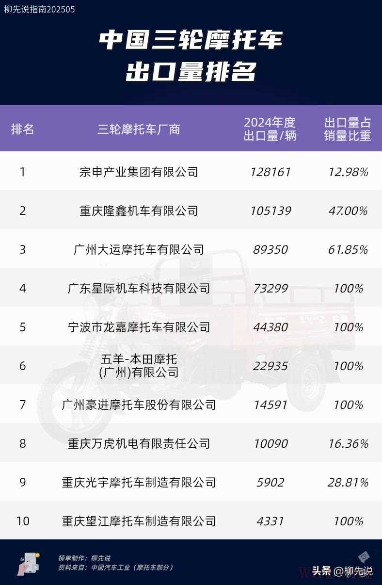 榜单1-5名:宗申产业集团有限公司、重庆隆鑫机车有限公司、广州大运摩托车有限公司、广东星际机车科技有限公司、宁波市龙嘉摩托车有限公司。宗申产业集团位居榜首,三轮摩托车年出口量约12.8万辆,出口量占销量比重12.98%。集团摩托车发动机、通机、新能源三轮摩托车产销量位居中国行业前列,其中,三轮摩托车产销连续19年领跑全球。