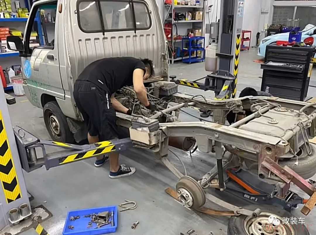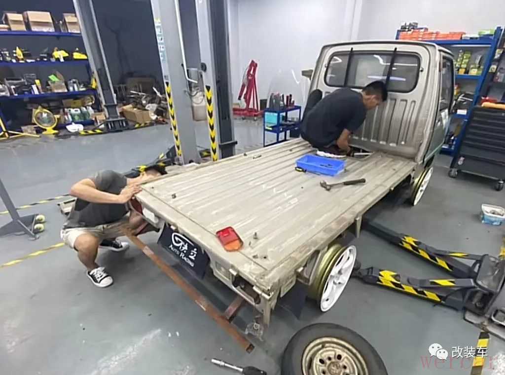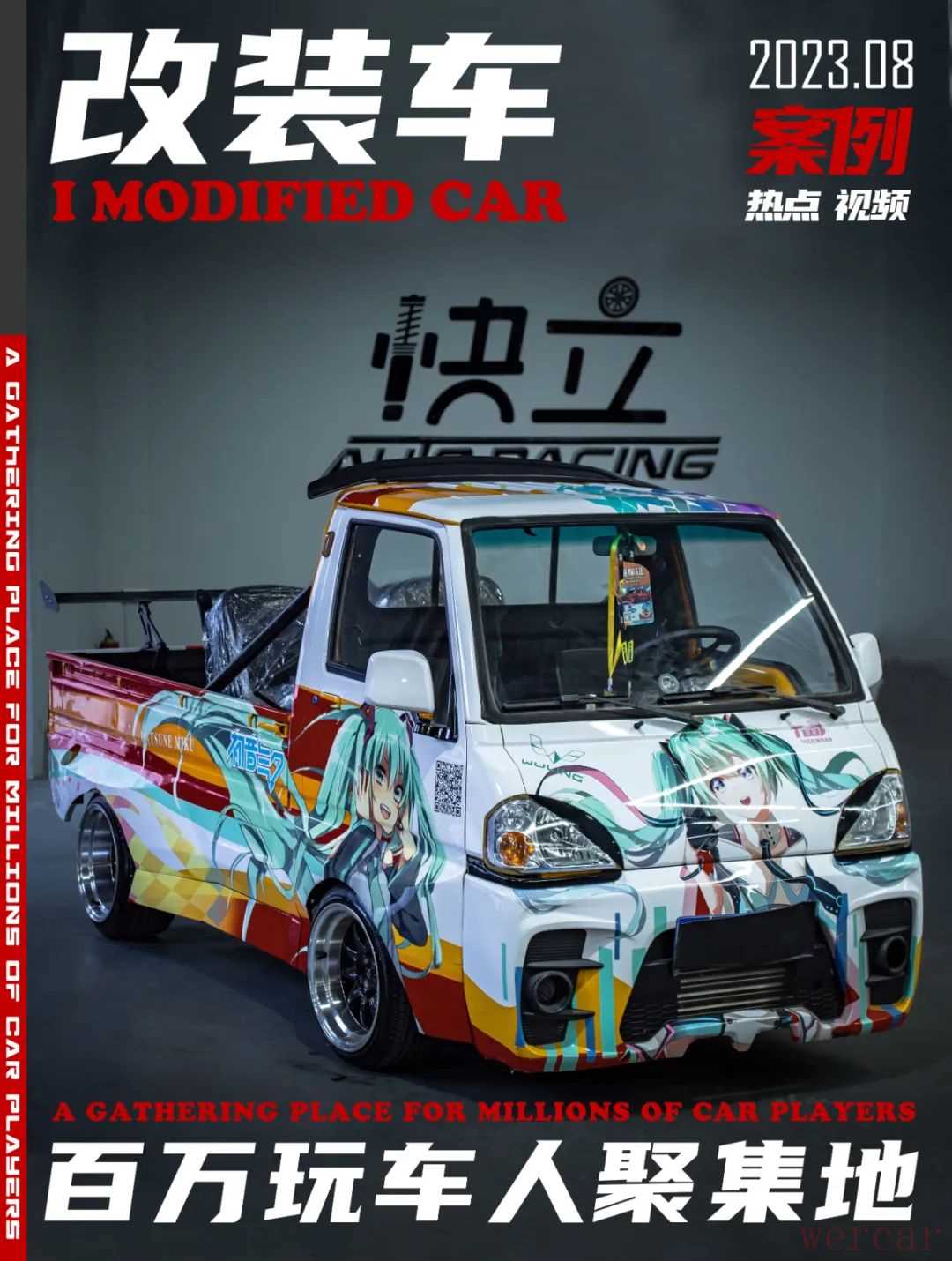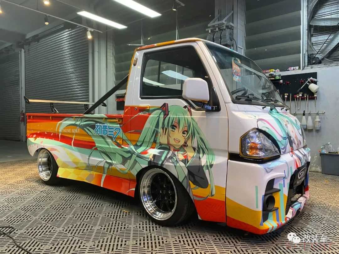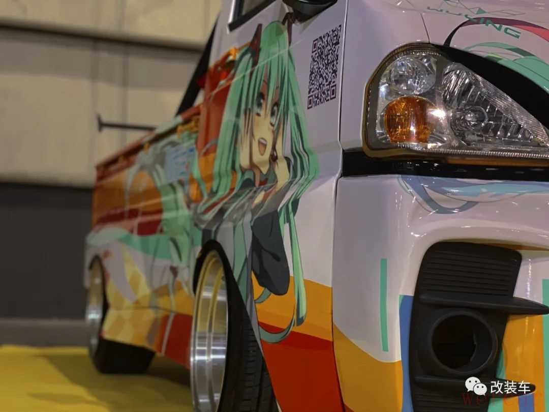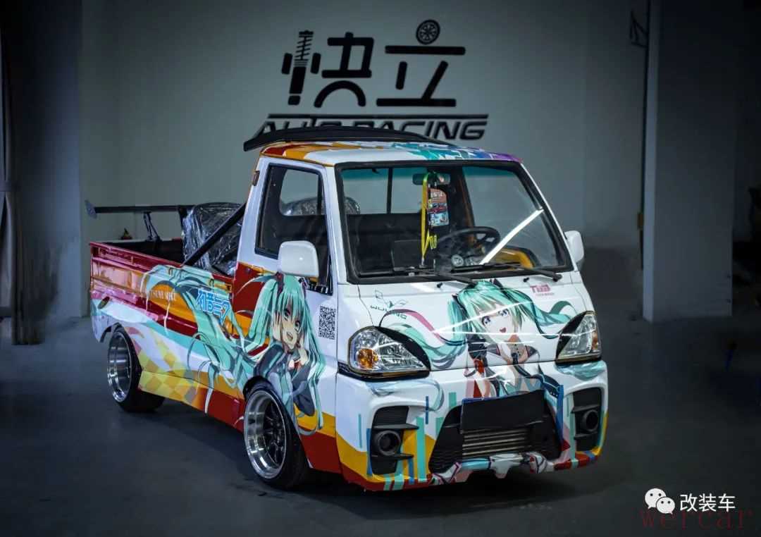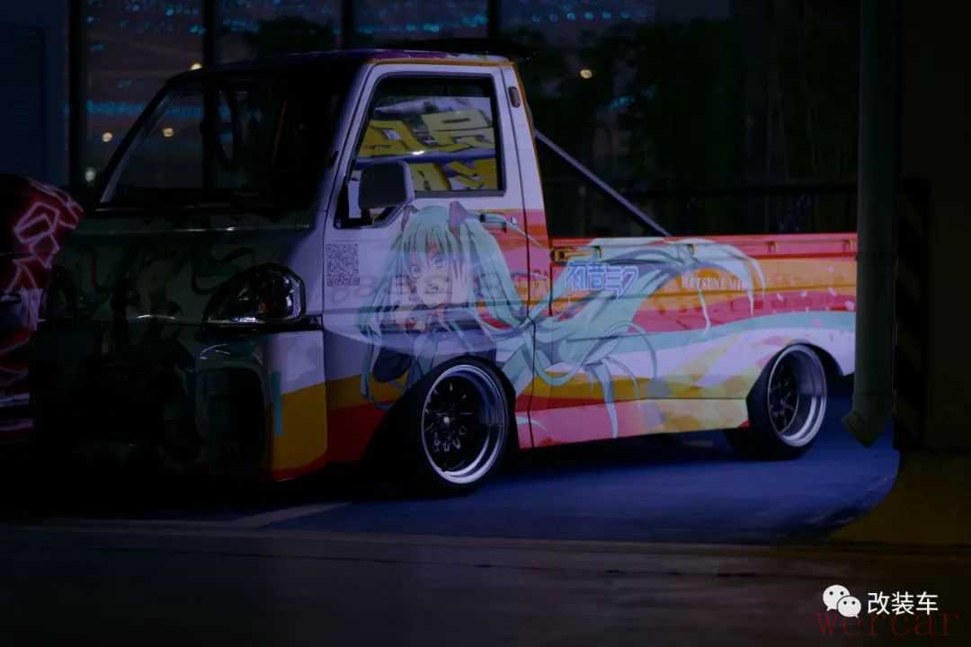 "外观方面,换上了DIY融合杠、DIY顽皮龙宽体、祖国版尾翼,加了个DIY简易版防滚架,最终还贴上了一身初音未来涂装,看起来非常战斗、非常有个性!让这辆原本并不起眼的小微卡变得很吸睛。"