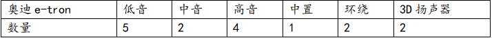 一套为入门款标配的10扬声器的音响系统,另一套为中高配标配的16扬声器的B&O音响系统,不过入门款可以通过10000元的价格选装这套系统,也是给对音效有要求的消费者提供了选择的权利。奥迪e-tron音响系统最大的亮点也是卖点的就是这套B&O系统,据资料显示,这套音响为3D Bang&Olufsen 高保真音响系统,总功率为705W,本文也是重点分析这套系统。16扬声器的各个音频数量分布如下: