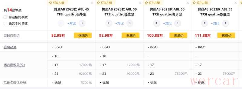 奥迪A8的B&O 音响系统会比奥迪e-tron提供更高的选装配置,不过价格也会相应的更高。