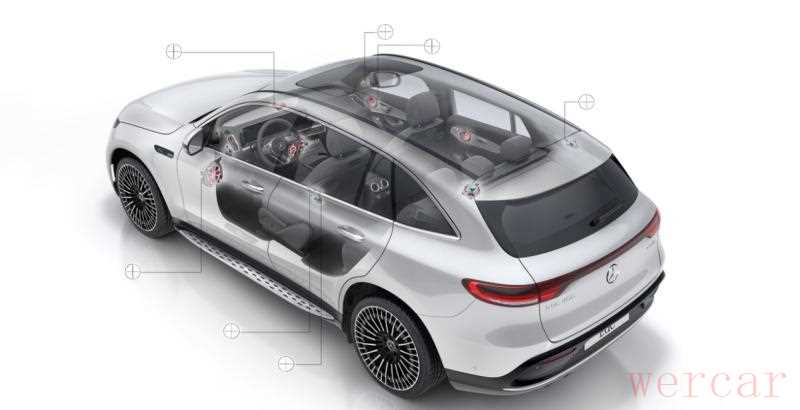 奔驰EQC的这套13扬声器的柏林之声音响系统由1个中置扬声器、4个高音扬声器、2低音扬声器、4中音扬声器、2环绕式扬声器。