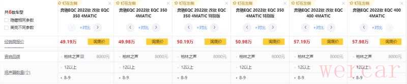 从懂车帝车型配置库和媒体资讯可知,2022款奔驰EQC全系标配9扬声器的未知品牌的音响系统,比奥迪e-tron标配的10扬声器音响系统显得拉胯。值得一提的是,奥迪e-tron中高配车型均是标配了高端的音响系统,而奔驰EQC只能通过8000元选装好一些的柏林之声(Burmester)音响系统。