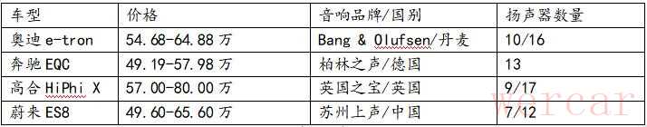 5、竞品参数对比不管是花10000元选装B&O 系统还是中高配车型本身标配的B&O 系统,在同级车型中都比较有竞争优势。在50万级以上的豪华电动车型中,奥迪e-tron也有许多竞争对手,其中就包括了高合HiPhi X、沃尔沃XC90、奔驰EQC等车型,下面就来到了文章的第二个问题,这套音响系统与同级车相比是什么水平?