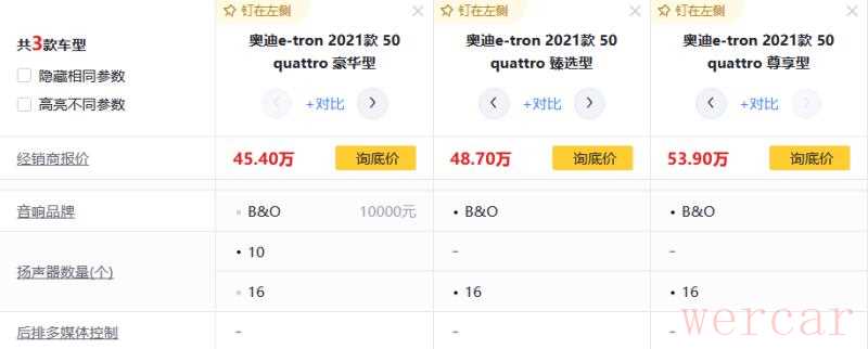 2、车型搭载音响概况从懂车帝的车型配置库中可以看到,奥迪e-tron是有两套音响系统的。