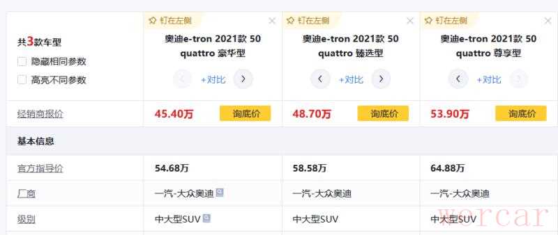 那么奥迪e-tron这套音响系统表现如何?与同级车相比是什么水平?是否是越级配置?下面本文就将带着这些疑问尽可能的剖析奥迪e-tron的这套音响系统。1、奥迪e-tron车型介绍奥迪e-tron是奥迪的首款量产纯电动SUV,定位中大型SUV车型,于2018年9月18日全球首发,于2019年11月18日在国内正式上市,并于2020年开始国产。目前在售的为2021年4月上市的2021款车型,一共三款车型配置,分别是售价为54.68万的奥迪e-tron 2021款 50 quattro 豪华型、58.58万的奥迪e-tron 2021款 50 quattro 臻选型、64.88万的奥迪e-tron 2021款 50 quattro 尊享型。