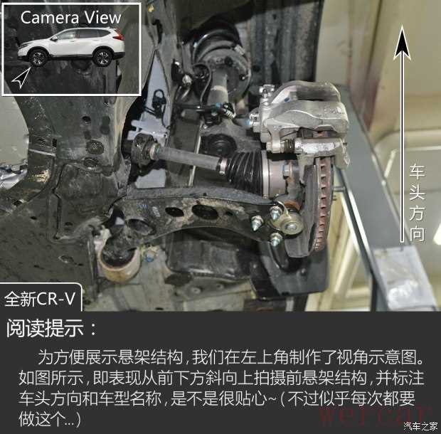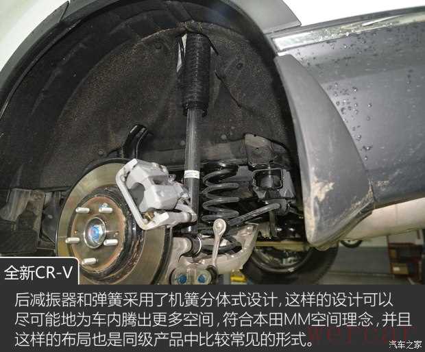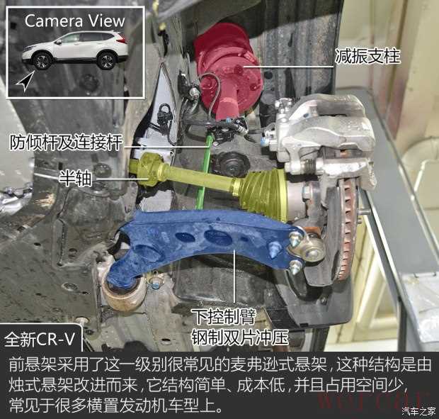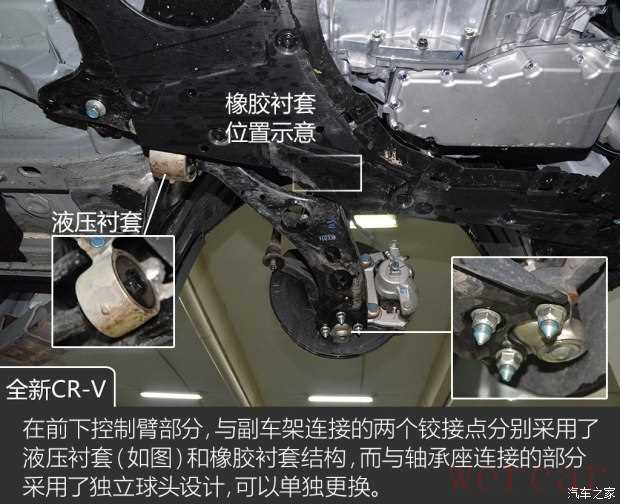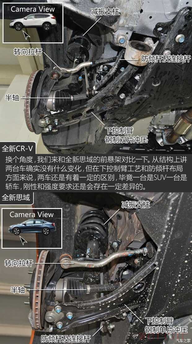 与上一代车型一样,全新CR-V采用了这一级别SUV非常常见的前麦弗逊式悬架结构,只不过这新老两代之间的“麦弗逊+多连杆”可没有什么交集,而全新CR-V从技术上更趋近于全新思域。再与同技术平台的思域相比,由于其SUV车型的身份,在强度和刚性方面的要求要更高一些,故全新CR-V在下控制臂方面做了一些强化处理。