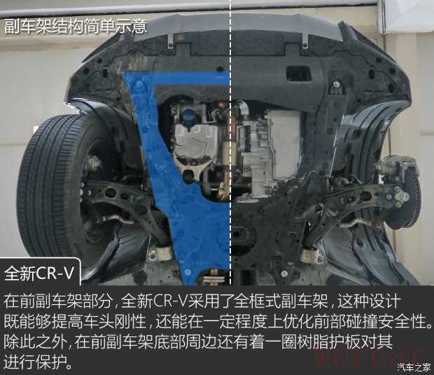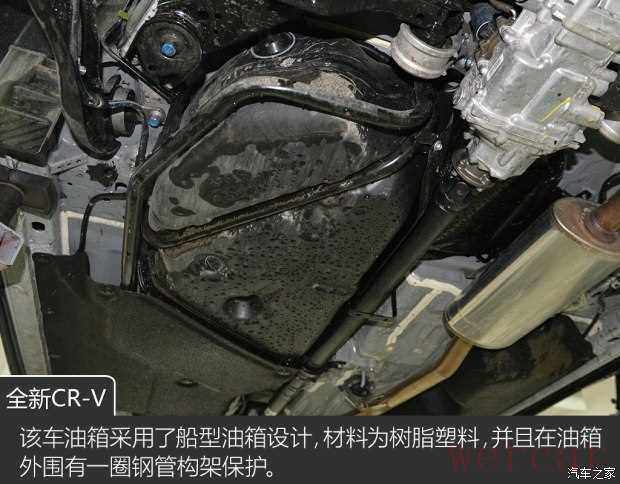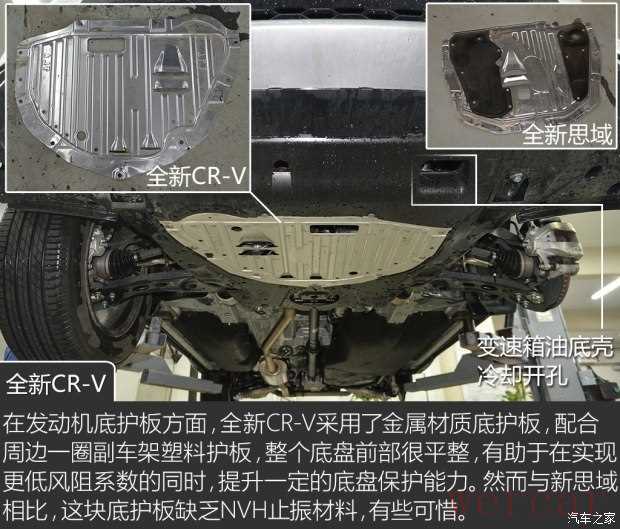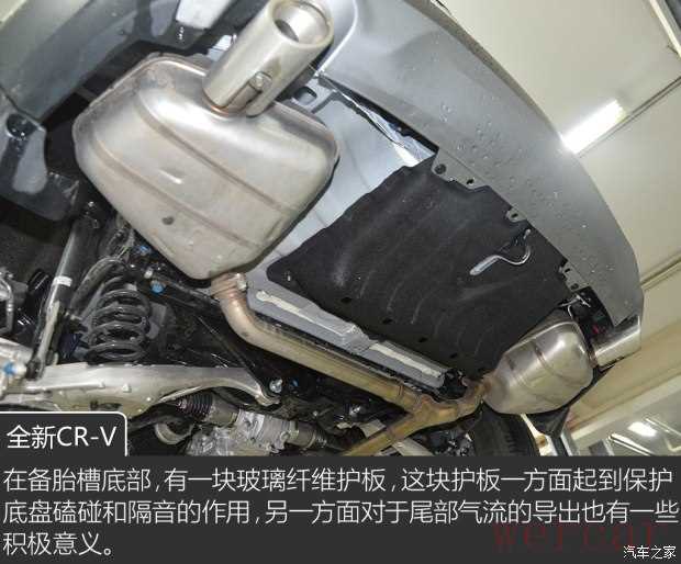虽然全新CR-V底盘中部未采用全封闭式设计,但其必要的一些底板保护也是存在的,这样的设计是因为传动轴的存在,导致全新CR-V的底护板无法做到完全封闭而为的。另外左右这两块局部底护板在前端也都有着较大的斜角设计,优化空气动力学。