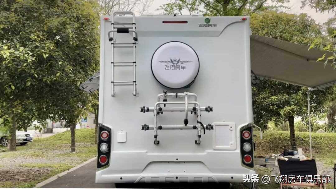 而在车尾处,配备的后爬梯与自行车架,为户外出行增添了更多可能性。平时可以通过后爬梯爬上车顶,检查太阳能板、清理天窗,也能在车顶放置一些不常用的大件物品;自行车架则可以固定两辆自行车,到达目的地后,近距离感受当地的风土人情。