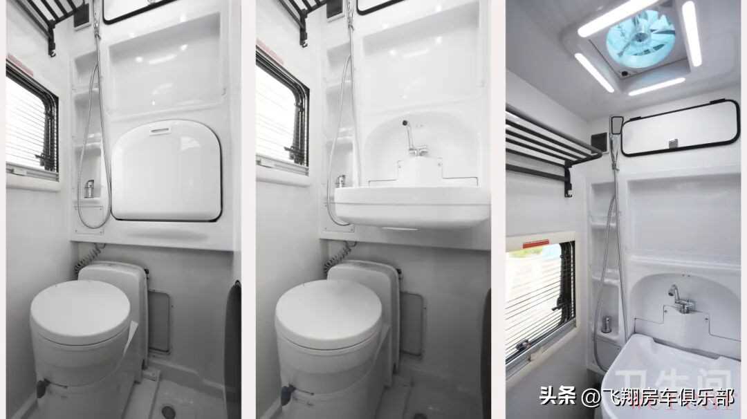 后方则是卫生间,门板采用了圆弧形设计,在有限的空间内增加可使用面积,里面的设施也是一应俱全,从储物空间、换气扇、淋浴花洒洗手池、抽拉马桶、外推窗一应俱全,满足一个人在里面洗漱洗澡上厕所。