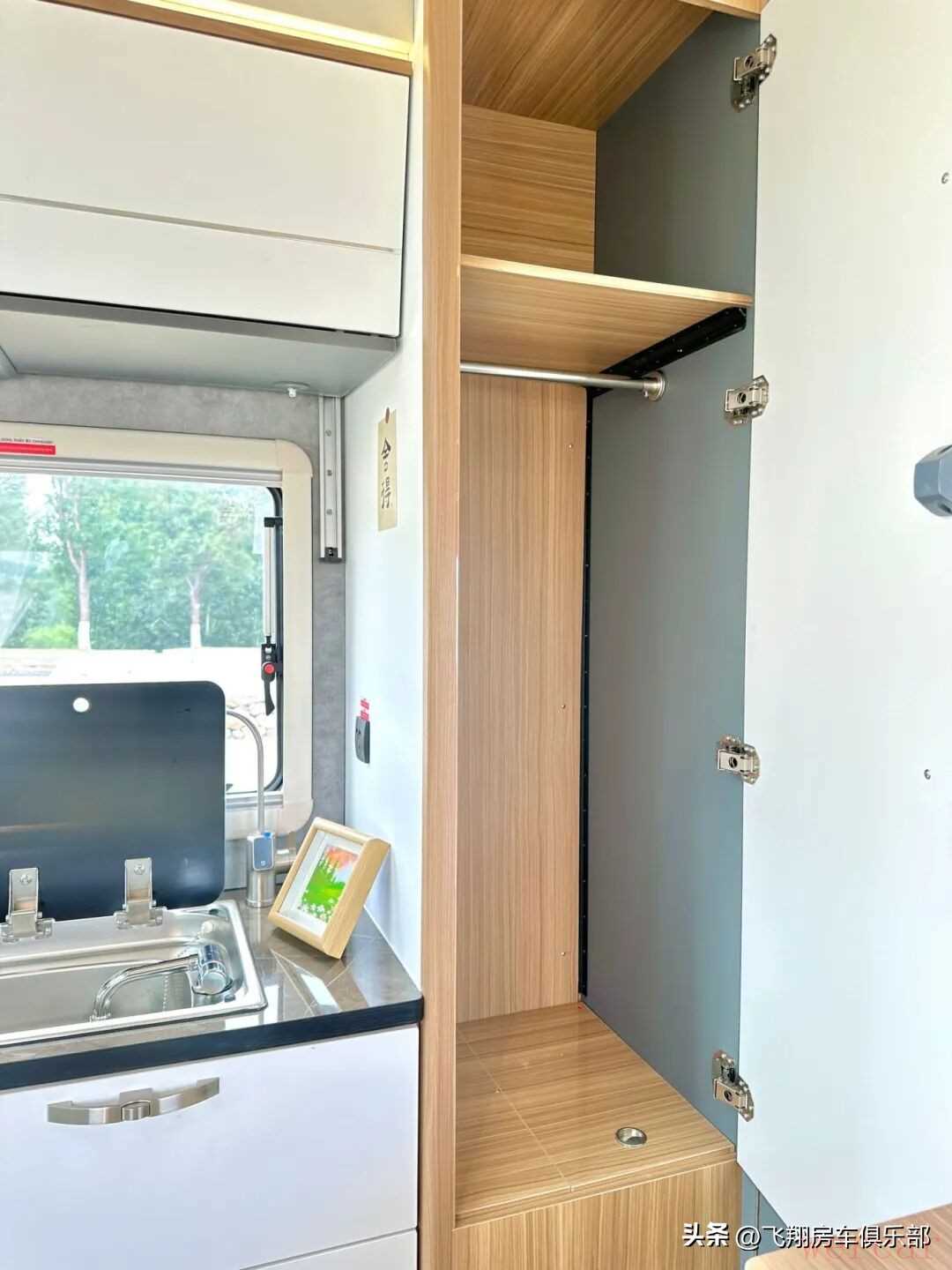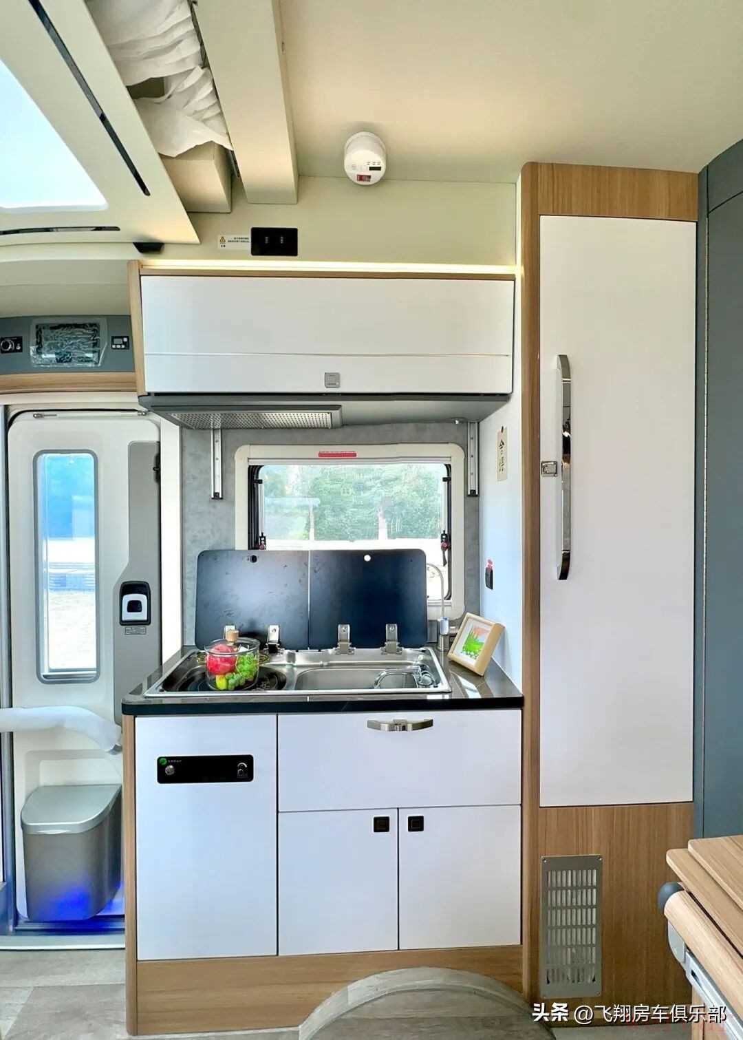 会客厅一侧的厨房区域,虽然空间不算特别大,但设施齐全、收纳合理,完全能满足家庭旅途中的烹饪需求。想要做简餐,这边有96L双开门冰箱以及微波炉,足够使用,至于想做大餐,则可以来到这边,整体非常干净整洁,将盖板打开,洗菜池、柴油炉,满足日常的烹饪需求,至于油烟问题也相当简单,上方还设置了可升降抽油烟机,如果感觉这个位置有点高,还可以油烟机进行下降,这样在使用的时候,油烟可以更好的排到车外,与此同时,旁边的空间也变得更多,下方当做调料放置区,上方则可以当做一个临时的置物台,放置一些备品,恰到好处!