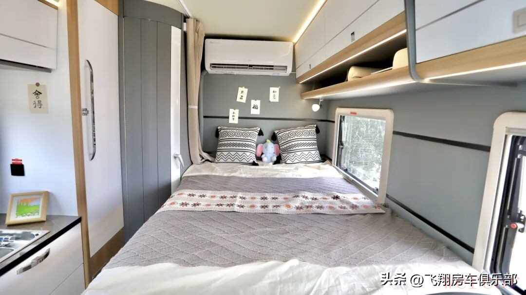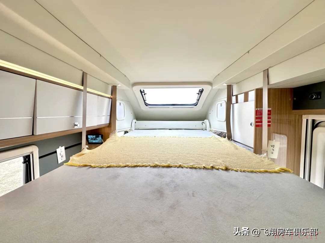 对于房车而言,睡卧区的舒适度直接决定了旅行的体验感,而这款房车在睡卧区的设计上,充分考虑了多人出行的需求,既保证了睡眠质量,又兼顾了空间利用率。首先是固定双人床,位于车身后方,尺寸达到了1.3米×2米,完全能媲美家用卧室的双人床。