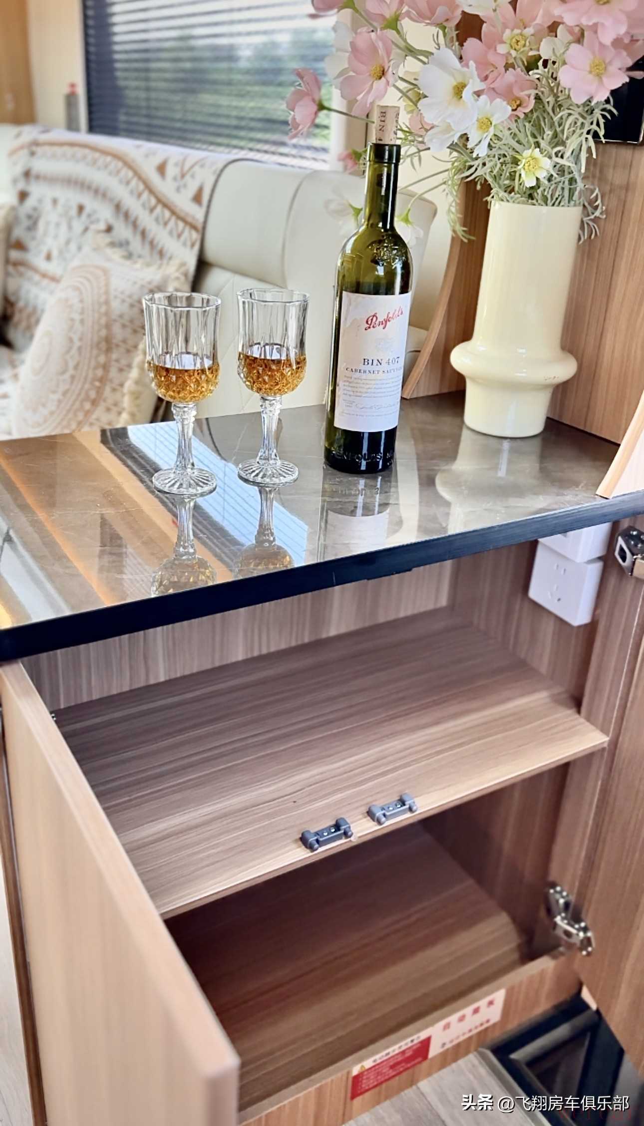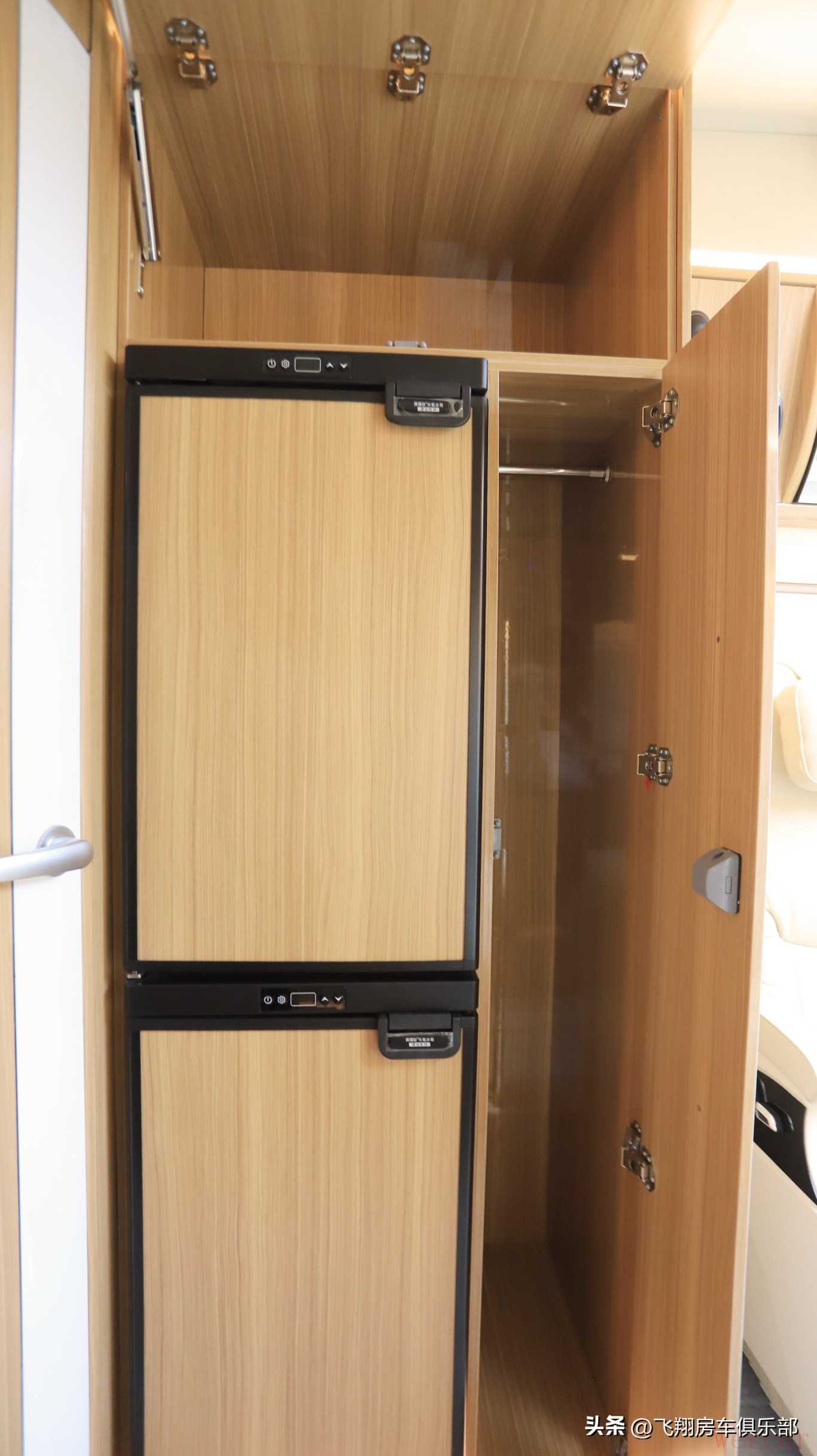 对面的大储物柜空间充足,下方的房车专用152L大容积冰箱,满足一周的食材储存需求。旁边的立式大衣柜,让您的衣物能够整齐悬挂,避免褶皱。