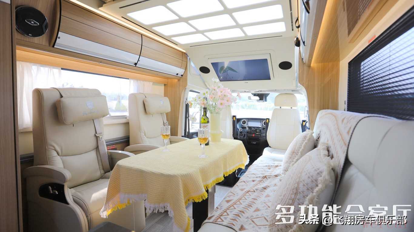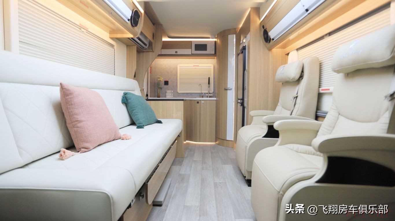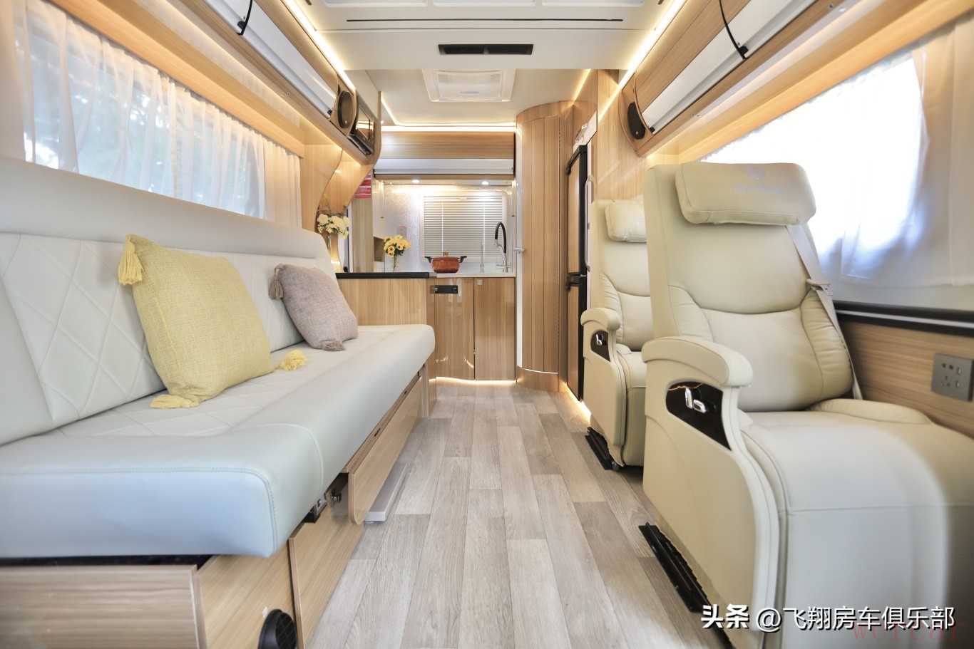 步入车内,高光免漆原木色内饰风格扑面而来,温馨且舒适。会客区的两个航空座椅,符合人体工程学设计还具备多角度调节功能,在长途旅行中为您舒缓疲劳。座椅旁的USB插座和无线充电装置,时刻为您的电子设备“保驾护航”。主副驾驶座椅可180度旋转,与沙发形成超大会客区。
