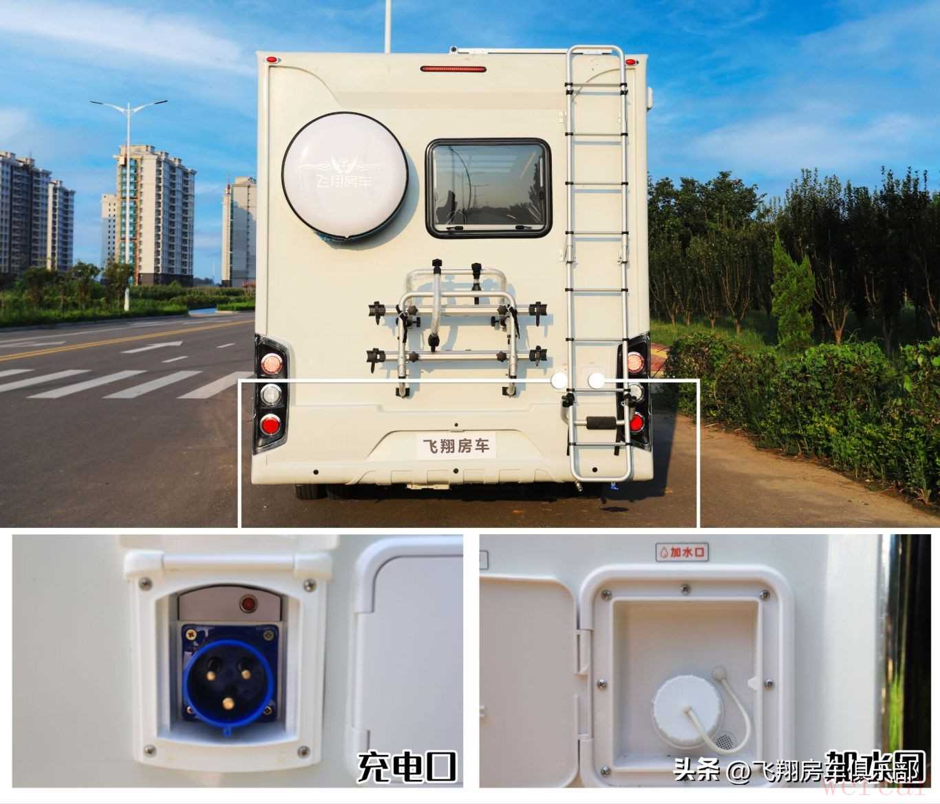 车尾部安装了自行车架和后爬梯,自行车架让您在抵达目的地后,可随时骑行游览周边风光。后爬梯则方便您上下车顶进行登高望远看风景亦或者去擦拭车顶的太阳能板。而后爬梯的下方,则是外接市充电口以及重力加水口,方便后期的电力和水源补给。