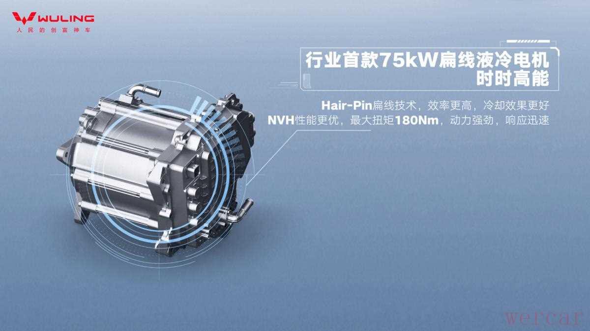 另一方面作为驱动车轮的主力,宏光增程版的后电机同样采用扁线液冷技术,75kW/180N·m的峰值功率/扭矩看似不起眼,但考虑到电机低转高扭的特性以及整车的电耗,这颗电机属于够用有余的水平,盲目用更大功率的电机意味着电机本体体积、电耗都会同步提升,这不是宏光车主们想要得到的。