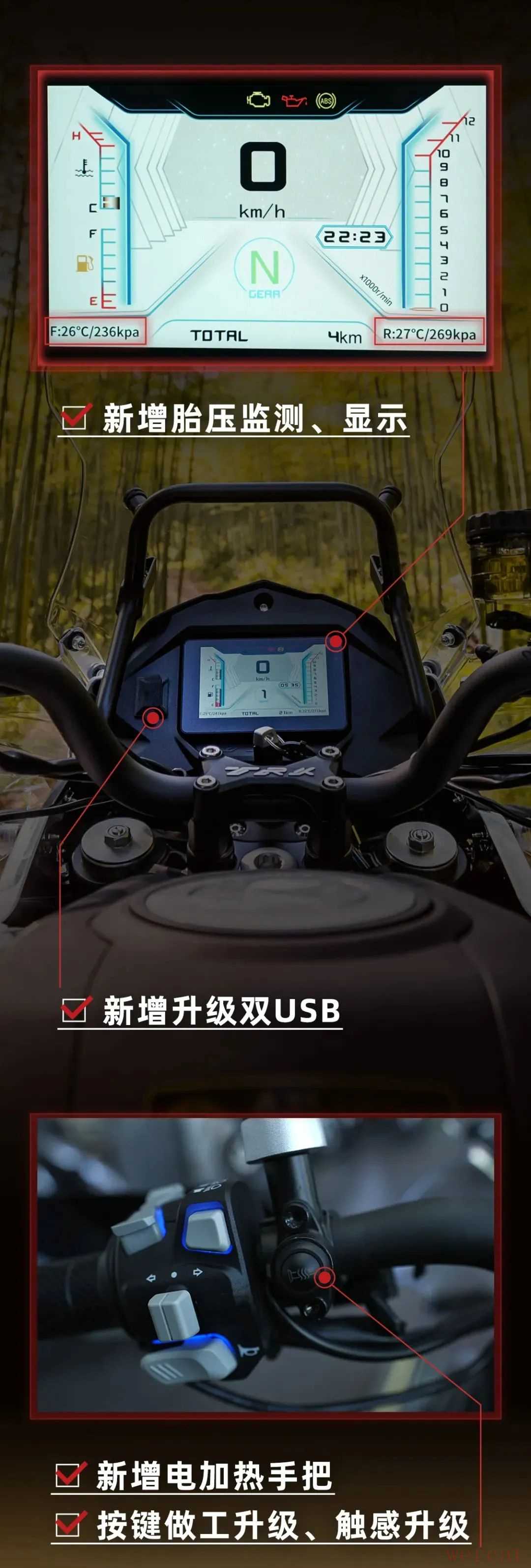 7项升级中的3项均来自电子功能,包括新增了车联网系统(支持手机投屏),胎压监测和胎温显示,以及电加热手把,不过按之前经销店曝光的信息,加热功能只有1档,不像市面上主流的电热手把改件一样,有不同的档位可以调节,但是有总比没有好呀。另外还升级了双USB接口和按键做工。