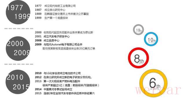 创建于1977年,是排名世界前八的汽车零部件供应商,全球雇员人数26000余名。作为世界500强企业,现代摩比斯始终以创新的思维、最佳的品质技术、令顾客满意的服务,不断巩固自身形象。现代摩比斯为实现Global Top Tier这一目标,以满腔的热情不断挑战自我,并与利益相关者共同创造价值共享利益,为公司可持续发展打下坚实而牢固的基础。