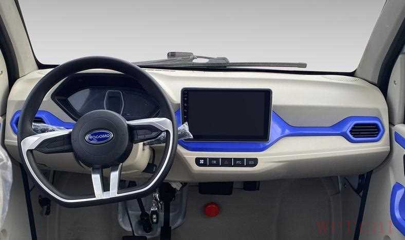 (4)功能配置:车辆在内饰方面,对标的是汽车材质,双色的内饰设计,搭配炭纤维纹理装饰,突出内饰的“豪华感”,2385mm的超长轴距,让它车内空间更足;配置了适应人体工学座椅,9寸高清智能多媒体触屏,可以实现人机交互、无线连接、倒车影像等智能体验,让车辆区别于传统的低速电动车。