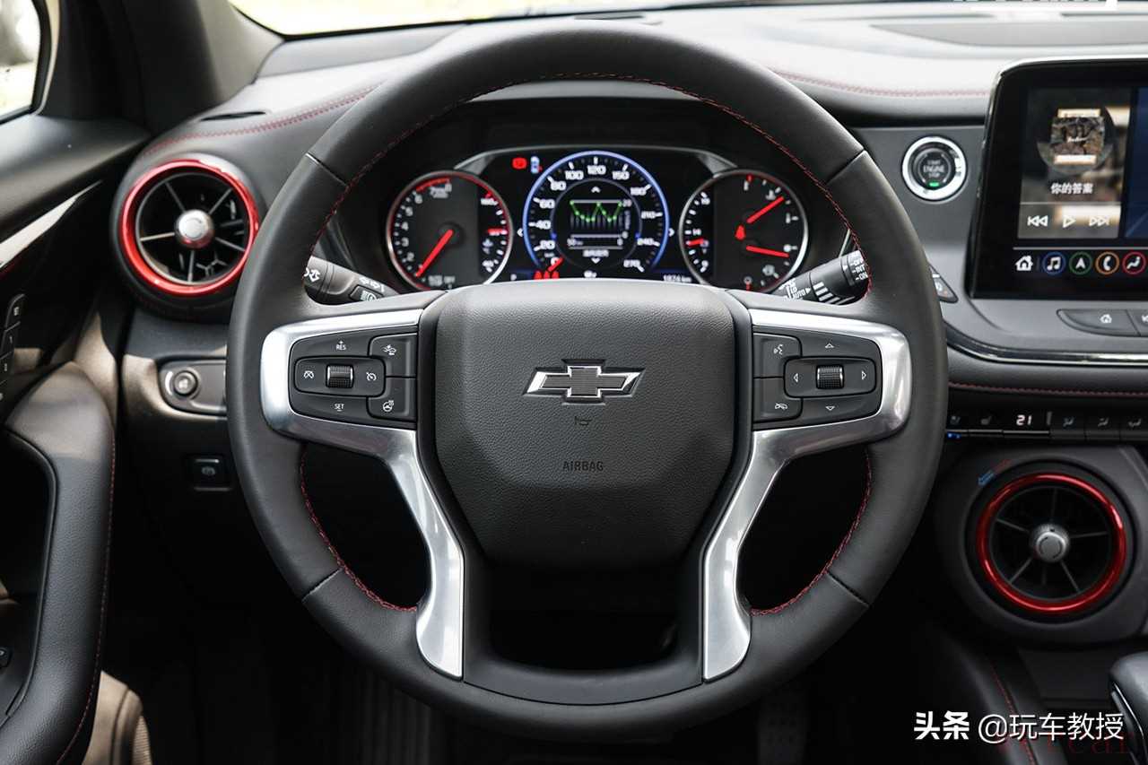 方向盘采用了四辐式设计,造型很有美式车的感觉,中间是一块矩形造型,看起来还挺爷们的。除了两侧的多功能按键,方向盘背部也有按键,是用来专门控制多媒体的,这是美系车的常见设计,因为刚好在三九点方向的背面,正常双手握方向盘的话,手指一定是在背部按键上的,所以用起来很方便。