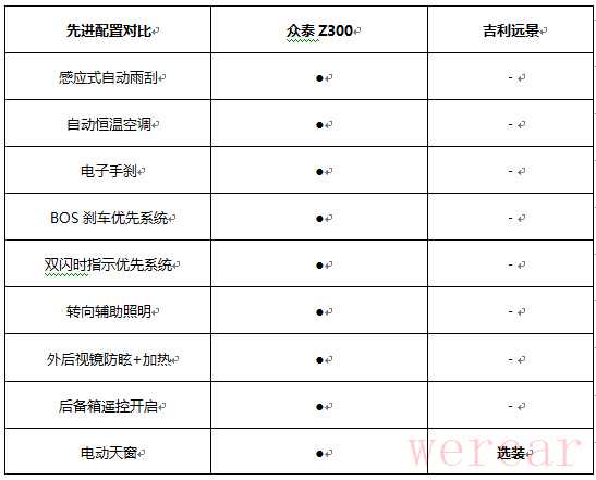 众泰Z300在其他配置方面,表现同样更为不俗,全系标配电动后视镜 、主/副驾驶安全气囊 、ABS防抱死系统及制动力分配系统等。优化的部分主要集中在配置方面,除低配车型外,2016款众泰Z300在后排区域增设了12V独立电源、USB充电接口及皮质座椅,在高配车型中还装配有电动天窗、多功能方向盘、一键启动、无钥匙进入、电子手刹等装备,关键是在这些吉利新远景没有的配置基础上,Z300还要便宜几千元,各位精打细算的小伙伴们,你们心动了吗?