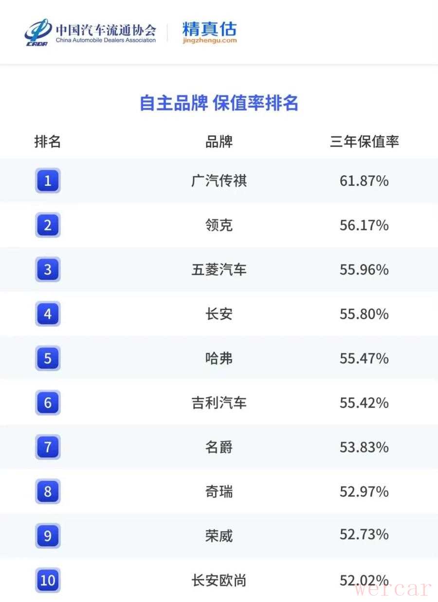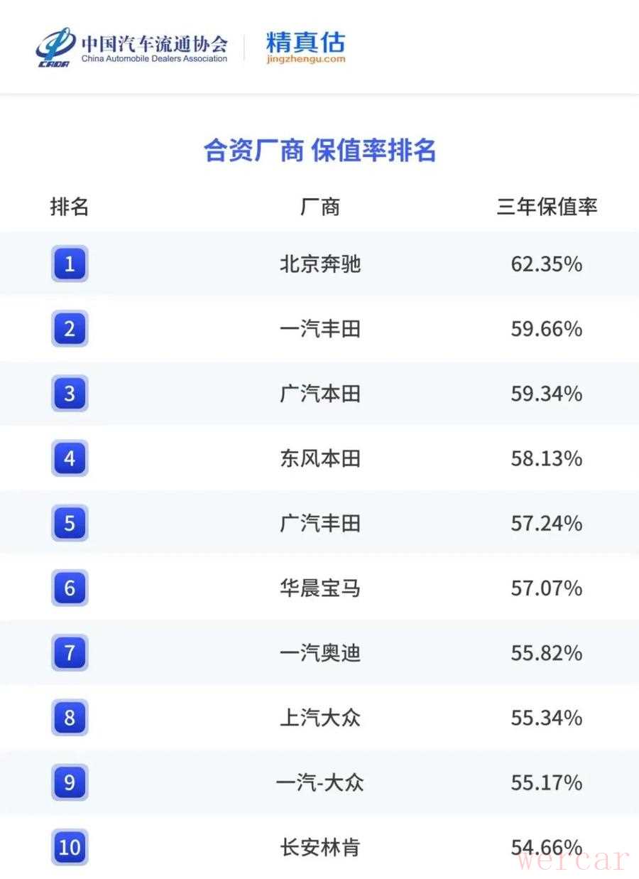 在自主品牌保值率中,广汽传祺保值率为61.87%,为唯一保值率超过60%的品牌,而包括领克、五菱、长安、哈弗、吉利、名爵、奇瑞、荣威和长安欧尚等品牌保值率均在50%以上。在合资品牌保值率方面,北京奔驰保值率位居榜首,为62.35%;一汽丰田、广汽本田、东风本田、广汽丰田、华晨宝马、一汽奥迪、上汽大众、一汽-大众和长安林肯保值率均高于50%,其中一汽丰田和广汽本田均进入榜单前三名,保值率分别为59.66%和59.34%。