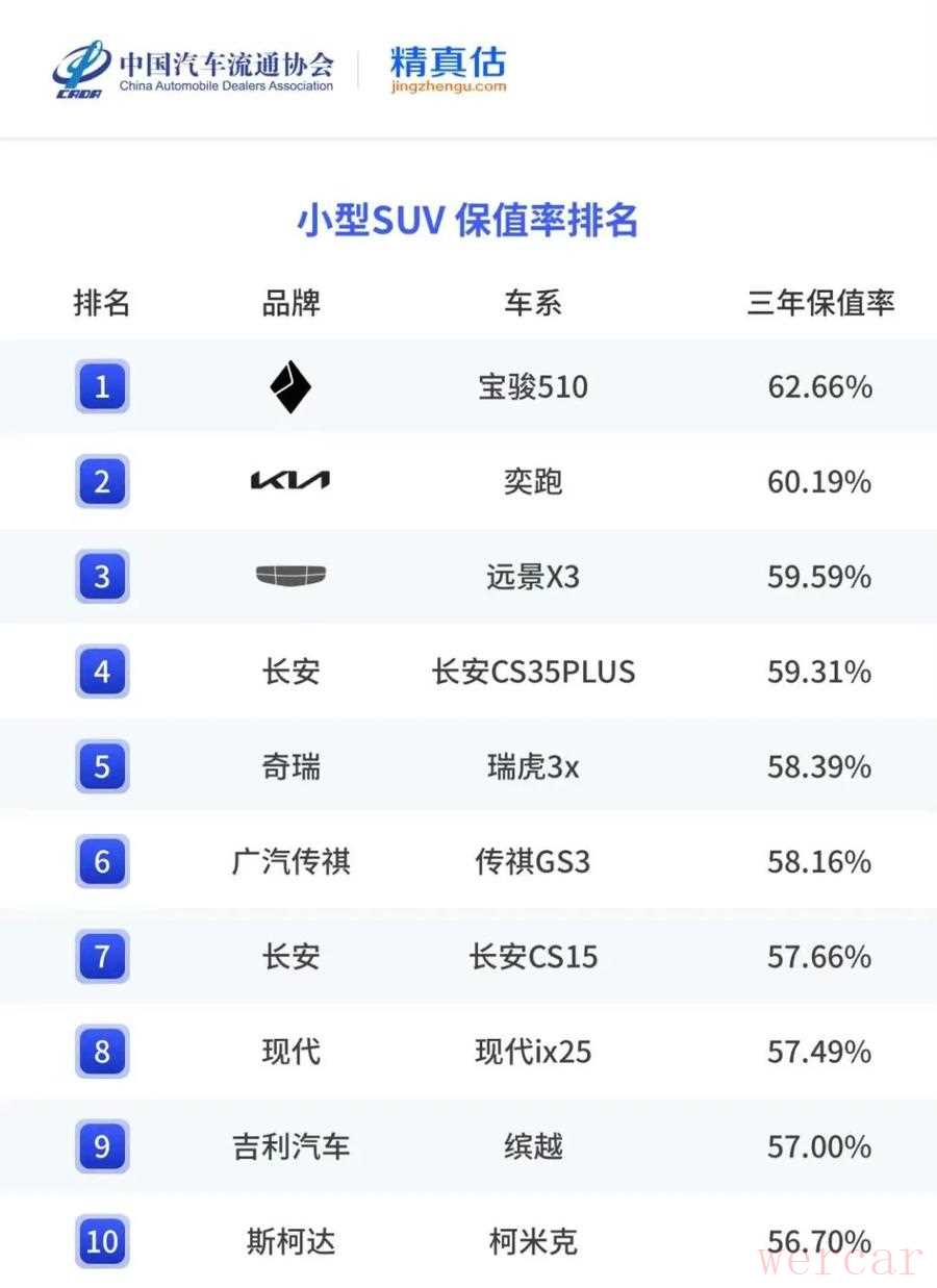 在小型SUV市场中,保值率最高的是宝骏510车型,保值率为62.66%;奕跑和远景X3三年保值率分别为60.19%和59.59%。