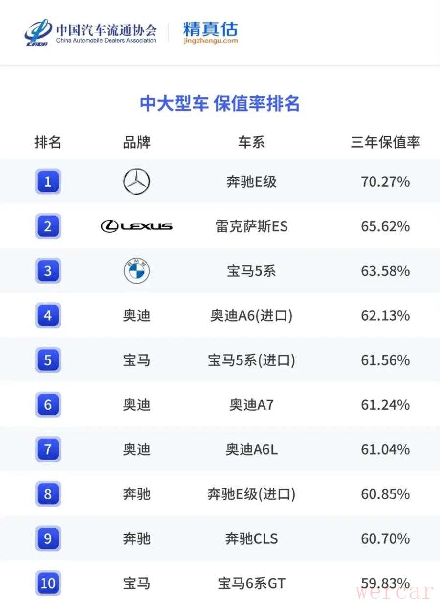 在中大型车市场中,产品相对较少,保值率表现可以说中规中矩,其中奔驰E级、雷克萨斯ES、宝马5系三年保值率分别为70.27%、65.62%、63.58%。
