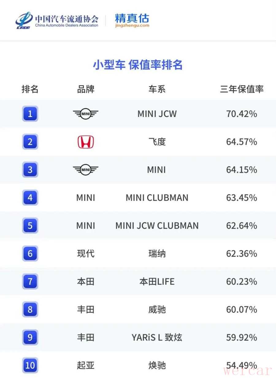 除了公布各国系品牌的保值率之外,中国汽车流通协会还公布各细分级别车型的保值率排名,其中,在小型车市场中,三年保值率前三名分别为MINI JCW、飞度和MINI,值得一提的是,MINI JCW这款车型虽然小众,但作为进口车型其还是受到不少用户的追捧,2024年其三年保值率高达70.42%,后两者则分别为64.57%和64.15%。总体来看,在榜单中,有四款MINI车型进入榜单,这也从侧面反映出MINI品牌在小型车市场的地位。