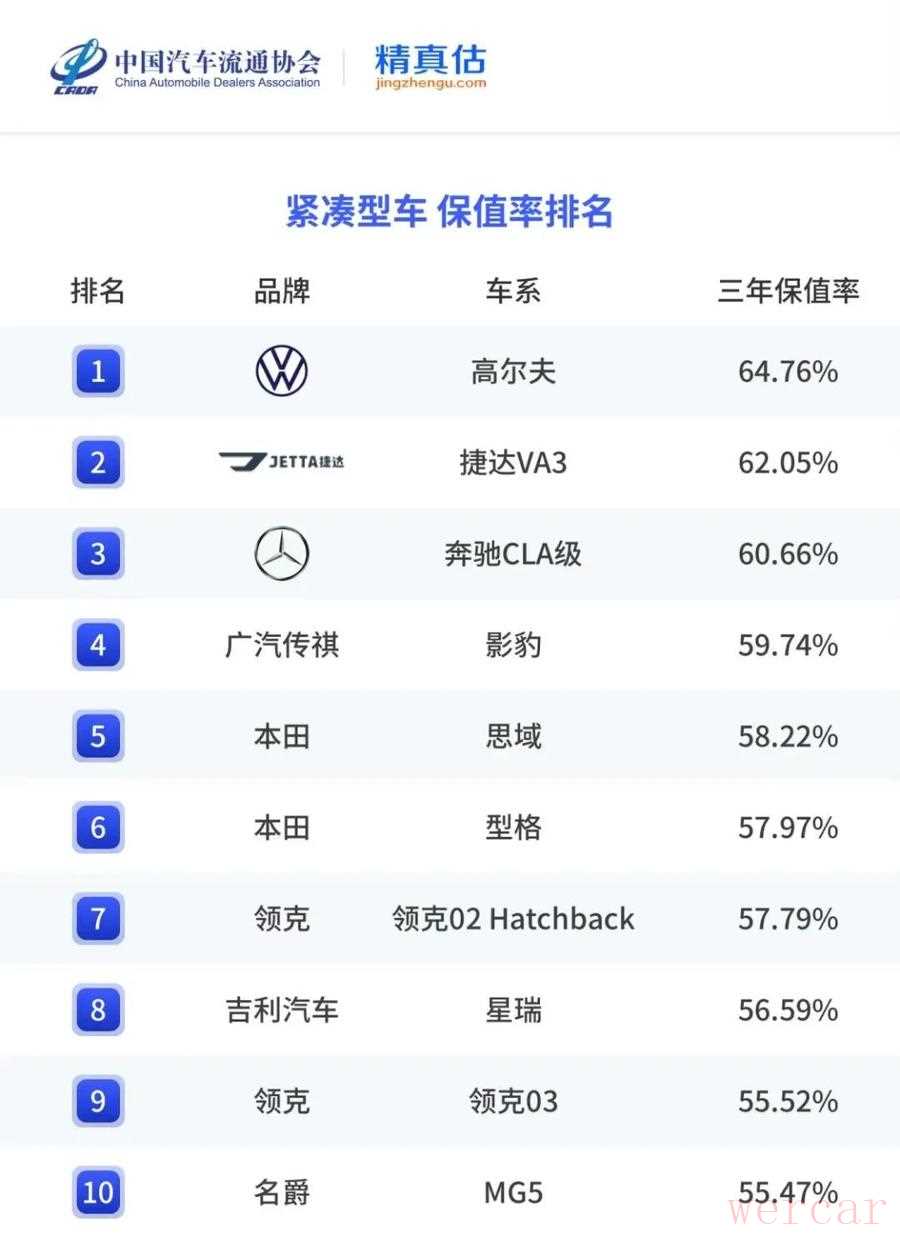 在紧凑型车市场中,大众高尔夫三年保值率最高,为64.76%;此外,捷达VA3和奔驰CLA级保值率也均超60%,分别为62.05%和60.66%。