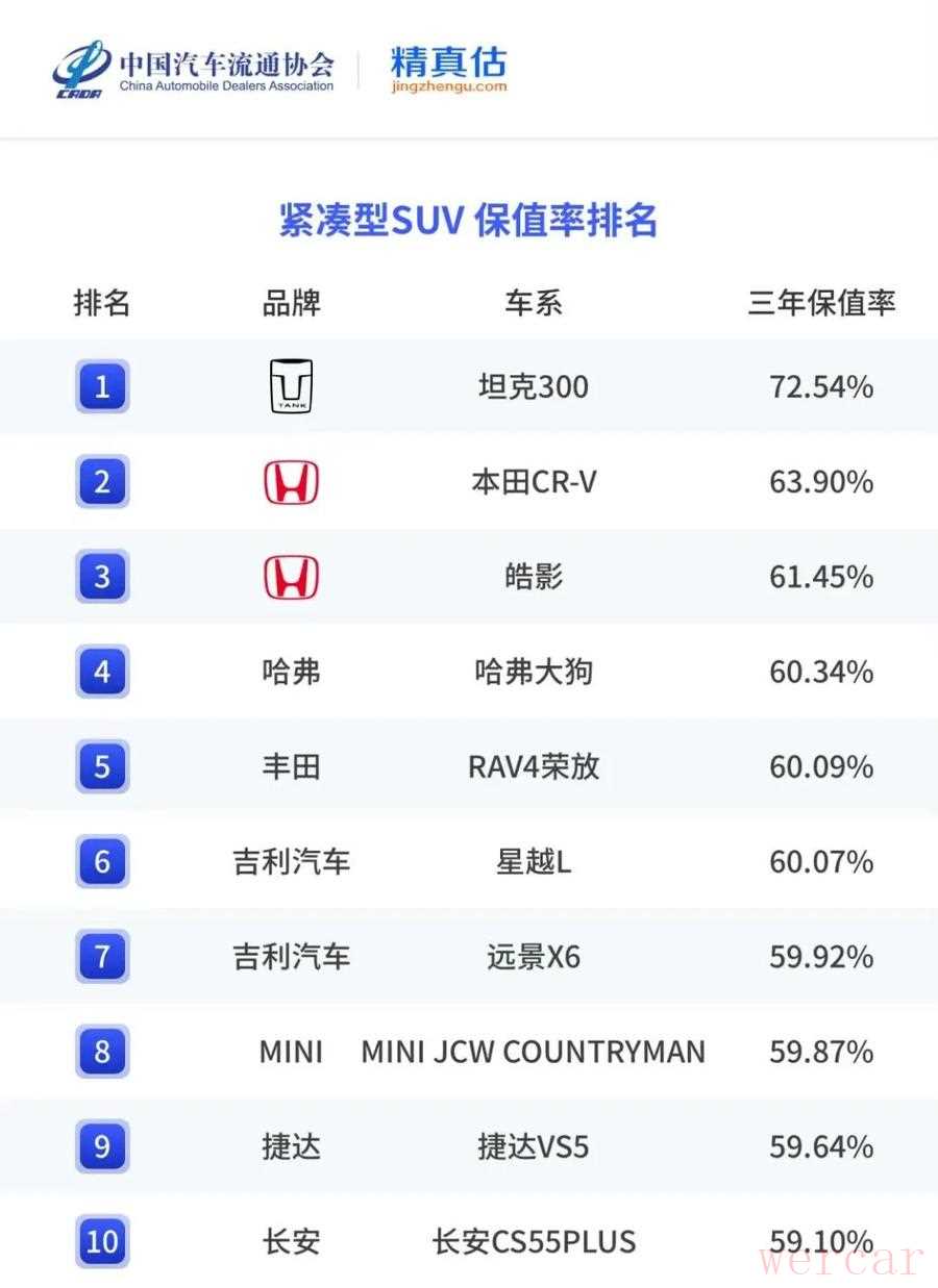 紧凑型SUV是SUV里销量最大、关注度最高的,保值率进入榜单前十名的车型包括坦克300、本田CR-V、皓影、哈弗大狗、RAV4、星越L、远景X6、MINI JCM COUNTRYMAN、捷达VS5、长安CS55 PLUS,其中坦克300保值率最高,为72.54%。据了解,坦克300于2020年12月上市,目前售价区间为19.98-33.00万元。作为紧凑型SUV车型,坦克300的推出降低了国内消费者入手硬派越野SUV的门槛,这也是坦克300上市后销量持续火爆的原因。